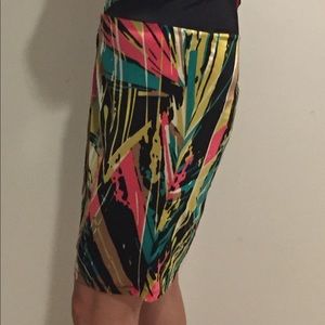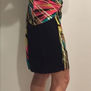 Stretchy and very comfortable, hits just above knee, washable. This is great to wear if comfort is a priority, but you still want a dressed-up look.