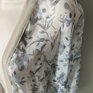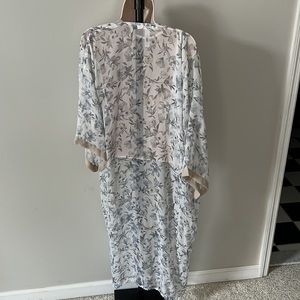 Open front duster. Beautiful, light, sheer, muted colors. Never worn no size listed but because it is an open front I would say fits almost any size S- XL.