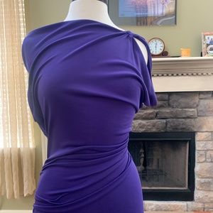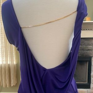 This dress is hard to photograph well because it is ALL about that drape. The material is medium-weight polyester which drapes beautifully to floor length. I honestly don't understand how they managed to make it drape so beautifully across the bottom of the back, but also have the dress be nearly backless. The construction in this thing is amazing. Chain lays asymmetrically across the back, and there is ruching on the right hip. Also on the right side is a thigh-high slit. Color is described as "Prussian Blue" on the tag, which is a very dark blue but can look slightly purple in some lighting.