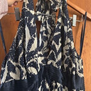 Floor length halter ballgown. Blue satin waist detail with sequins. Skims floor with 2in heels for 5’1” frame