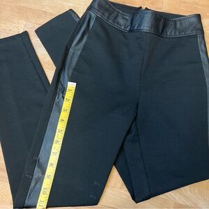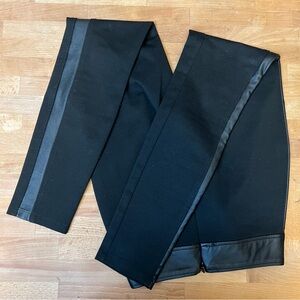Elegant black dress pants with faux leather side trim. Ideal for formal events. Comfortable fit. Some damage and wear on faux leather. From a clean non-smoking home.