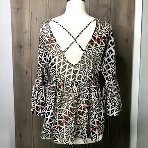 BCBG generation black cream and red ruffle blouse sheer peplum waist ruffled cuffs XS Style YJQ1685