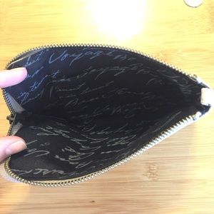 BCBG travel bag perfect for makeup or important items like keys, wallet, phone, etc. Grey leather exterior with shiny gold embossed lettering. Travel-themed with cotton lining and interior pocket with overall 'Bon Voyage' script print. Metallic zipper closure. Small discoloration on the loop that can be used to attach bag to luggage. Couple of small flaws on the back but overall in great condition. BCBGMAXAZRIA logos throughout.