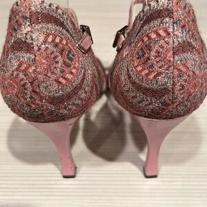 These incredibly unique BCBGirls open-toe heels in size 8.5 are a sight to behold. They feature a stunning Rose Pink shimmery upper adorned with a tapestry of paisley colors in rose gold and grays. The closed back is secured with a single front buckle T-strap, while the heels boast a 4-inch height. Each heel is encrusted with four delicate pale pink oval stones surrounded by a dazzling array of pink rhinestones.