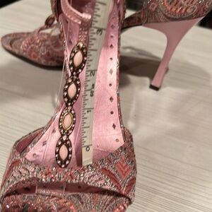 BCBG lWoman’s open toe paisley and beaded high heels Size 8.5