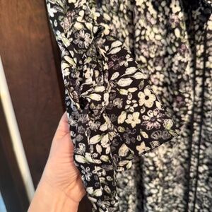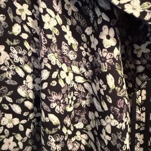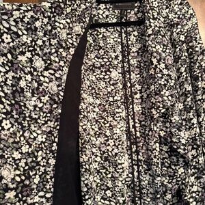 this is the cutest piece – it is an all-over floral print with black, white, lavender and green. It’s very lightweight and almost kind of like a swing coat. It has a wrap belt and ties around the wrists as well. It has vents up the side so it’s very flowy and it’s just a great thing to throw over a white T-shirt and jeans. since it is very billowy it can probably fit up to a medium. Depending on how much you want to wrap it around your waist.