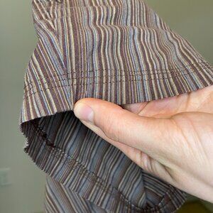 BCBG MaxAzria brown stripe low-rise shorts. Y2k vibes! I hemmed these myself (pictured) so they're a cute shortie (4" inseam) length. They no longer fit me (v sad) since I gained some booty (happy). Hook and zipper closure. In the last 2 photos they are shown on me (when I was a size 2 and they fit). Best fit a size 2, XS, or 26". Please see measurements in photos! Cottony fabric with a tiny bit of stretch. Don't mind the insulin pump in photos :)