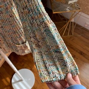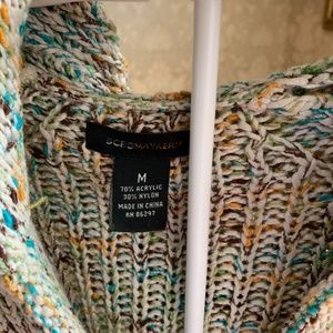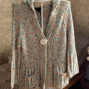 So cute. Big button, wide cuffs, great colors . Nylon-acrylic blend