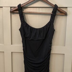 BCBG maxAzria ruched asymmetric hem midi dress black size XS