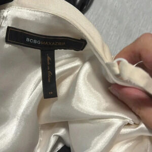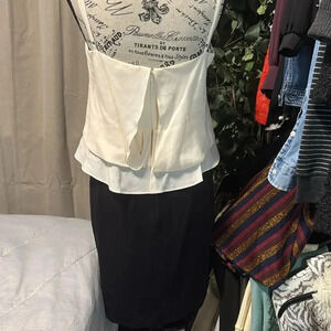 Gorgeous and comfortable. This designer dress is a classic silhouette featuring two adjustable straps a working zipper in the back and at the bottom of the dress it’s a very thick black fabric of 65% rayon. This also has 30% nylon 5% spandex and the lining is 100% polyester, with 100% silk as the bodice. It’s hard to photograph this color, but it is almost like a faint peach/pink. It is not white on the top- see the last photo for the closest accurate one This is double lined as well please dry clean. Only some wear on the left hanging strap but other than this call out it is in great condition!! Marked as an eight, hits just above the knees for me and I’m 5’5” silk luxury classic colorblock