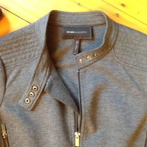 Size M BCBG moto jacket. Quilting along shoulders and elbows. Good condition, pilling along cuffs.