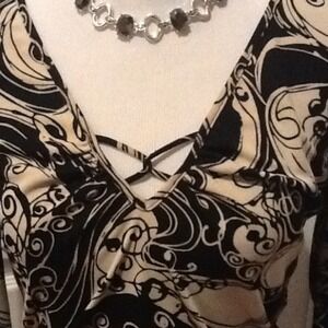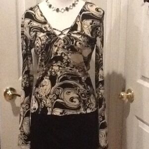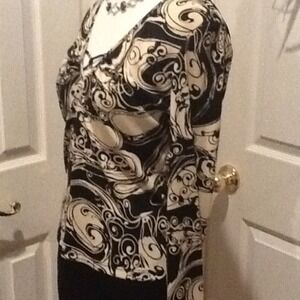 BCBG long sleeve black and white top with fabric detail at neckline. Comfortable and flattering fit.