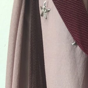Dress has alternating ruby colored sheer panels and long ruby colored ribbon that wraps around the waist.