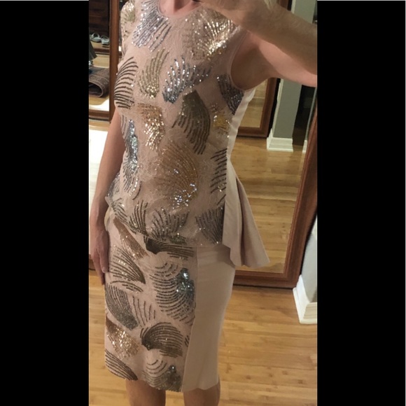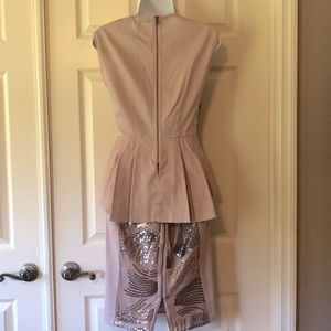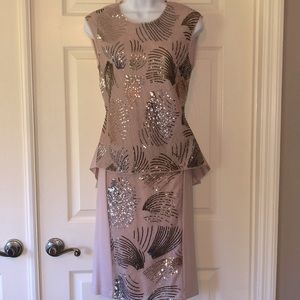Weddings or holiday parties…I am so in love with this outfit, I am on the fence about selling. Fitted “Savanah” pleated peplum top, adorned with lace and sequins, is 22” shoulder to front hem, and 26” at its longest in back (w/18” zipper). “Aideen”skirt is 25” long with full length back 2-way zipper. Waist is about 26”, slim skirt, but fabric panels are stretchy. See photos for care instructions. XS (size 2, not for the busty!). Dusty rose. New with tags.