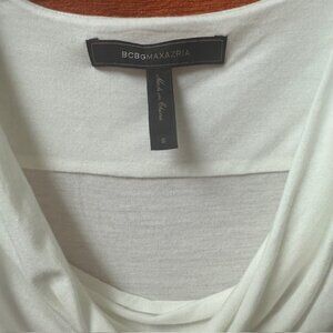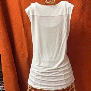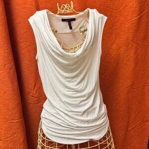 BCBG sleeveless lightweight top, Size Small. White, slightly off white, top with a scooped draped neckline. Looks nice alone or under blazer or cardigan. Great basic piece! Gently used (no rips, tears or holes) but no care tag. See photos for condition. Smoke free, pet free home.