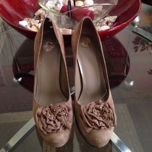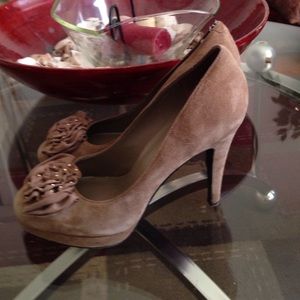 Beautiful taupe suede hill by BCBG. This shoe goes with everything and every color. With a cute taupe and gold studded flowered toe embellishment making the shoe really stand out. In great condition