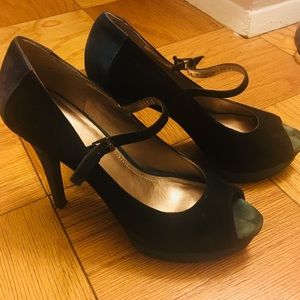 Color block pumps - black with blue heel, platform, and back of shoes, green toe; approx 3/4” platform and 4.5” heel; Mary Jane straps, gently loved