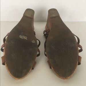 Gently used BCBG tan wedges with strappy design size 9. They show some signs of wear as pictured but are in great condition. The wedge height is 3.5". Have an adjustable ankle strap with buckle