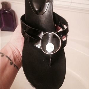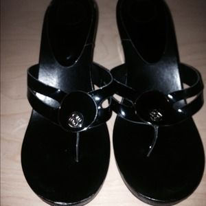 BCBG black wedge sandals. Some signs of wear and a few scuffs.