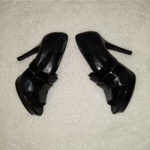 Black sandals with front T straps. 5" high heels, platform front heel. Very good condition. Minimal peel of inside leather of shoe.