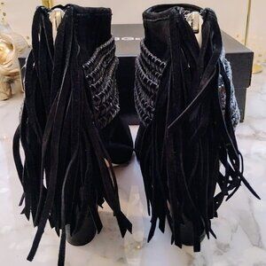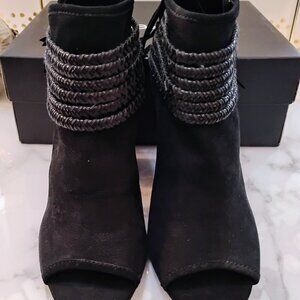 NEW BCBGeneration black soft suede open toe cowgirl style ankle boots. Zipper in back makes it easy to slip on. Zipper is hidden by fun tassel detail. Braided detail around ankle enhances the oh so popular western look. The chunky heel allows you to line dance in comfort all night!