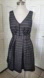 Sheer black striped mesh layer over cream lining. Sleeveless, fit and flare, vneck in front, deep sexy plunging vneck in back. Hidden pockets at hip / side seam. Concealed back zipper, hook and eye closure. Excellent condition.