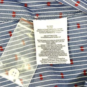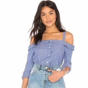 NWOT BCBGENERATION Blue & White Pin-Striped Red Embroidered Dot Cold-Shoulder Shirt. Size XS