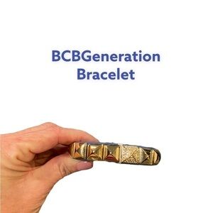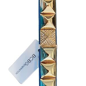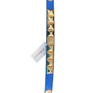 BCBGeneration Bracelet Blue with gold and white crystal findings two sizing clasps to fit a variety of wrists layed out flat its about 7 1/2 length approximately