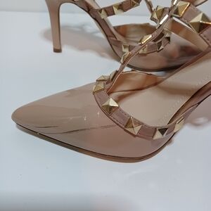 BCBGENERATION Darronx Heels Pointed Toe Nude/Tan studded Size 6M has a scuff on inside of right shoe see pictures for reference