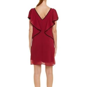 Used, good condition. Ruffle V-neck shift dress. Color: garnet with black trim. Deep V neck front and back. Ruffle detail. Midi length. Lined. 100% polyester. Size: XS fits like a small. Measurements see photos. Arm pit to arm pit: 17 inches.
