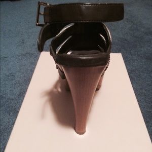 Bohemian style platform heels with ankle strap. Open toe. Wood heel.