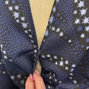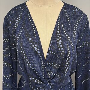 Excellent condition, BCBGENERATION Long-Sleeve Twist-Front Top Size M. Color twilight blue. Peplum top with allover starlight print and twist detail on the front. Pullover V-neck, long sleeves and one snap closure. 100% polyester - machine wash cold. See pictures for length and armpit to armpit measurements.