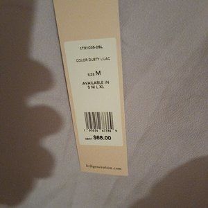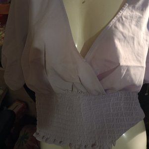 A DUSTY LILAC COLOR BLOUSE, NWT, SIZE MEDIUM, LOW CUT, HAS ELASTIC ABOUT HALFWAY DOWN IN FRONT AS SEEN IN PHOTOS, AND ALSO HAS ELASTIC IN SLEEVES, 3/4 SLEEVES, THIS IS NOT A SMOKE FREE ENVIRONMENT, SORRY FOR THE INCONVENIENCE.