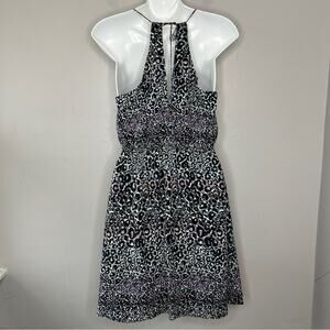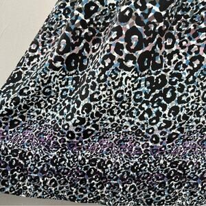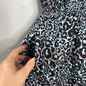 Spaghetti strap mini dress with ruffles on sweatheart neckline, elastic at waistline, and keyhole opening in the back where it ties. Front ties and scrunches up on the ruffle. Dress has pockets. Blue, purple, grey, black, and white colors in a leopard print all over. Dress is lined. The colors almost give Lisa Frank vibes!