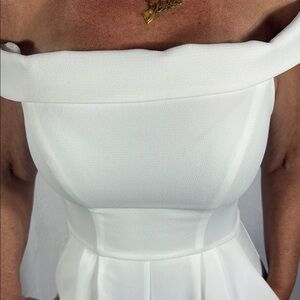 bcbgeneration jumpsuit, off shoulder jumpsuit, white cropped jumpsuit, women’s size 4 jumpsuit, cocktail outfit, bridal shower outfit, graduation jumpsuit, modern chic jumpsuit, white party outfit, classy event jumpsuit, wide leg jumpsuit, summer white jumpsuit, minimalist jumpsuit