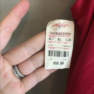 is a BCBGeneration One-Shoulder Dress, Draped, Pleats, Stretch, Solid Lipstick Red, Size Small. 15" across chest, 29" waistband, 37" shoulder to hem. Polyester/Spandex Blend.