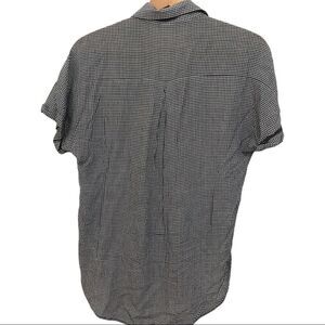 BCBGeneration Short Sleeve Blouse, Black and white check pattern, button front with twist/tuck at waist, high Low Size XXS