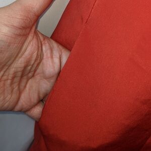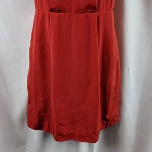 This dress is new without tags. It features a pleated detailing on the chest and back. The skirt is fitted to the waste and hips. The material has a silk like texture and look. Features fox buttons at neck. Skirt has a zippered fastener with hook and eye clasp. Small hole from security tag. Stitching has been reinforced under zipper. Please see photos for details.