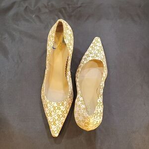 BCBGIRL POINTED TOE SLIP-ON WOMEN"S KITTEN HEEL PUMPS 81/2B COLOR MONOGRAM LOGO CREAM &YELLOW MADE WITH ALL MAN-MADE MATERIALS LINING BALANCE MAN MADE HEEL HEIGHT MEASUREMENTS APPROXIMATELY 3"INCHED THIS ITEM IS PRE-OWNED EXCELLENT CONDITION WITH ONLY LIGHT SIGNS OF WEAR IF ANY CHECK THE PICTURES