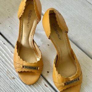 BCBGIRLS, LEATHER 4” HEELS IN MUSTARD COLOR. OPEN TOE, SCALLOPED TRIM. SCRATCH ON HEEL. SIZE 7B