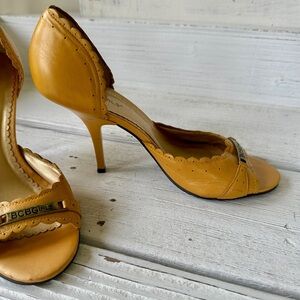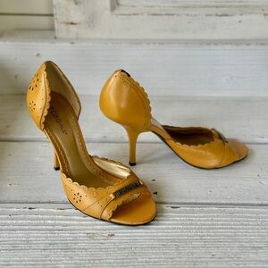 BCBGIRLS, LEATHER 4” HEELS IN MUSTARD COLOR. OPEN TOE, SCALLOPED TRIM. SIZE 7B