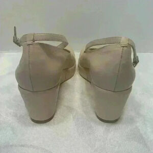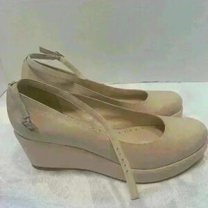 BCBGIRLS Pale Blush Pink wedge heel with ankle strap, size 7