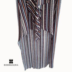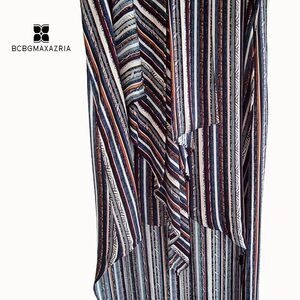 BCBGMAXARZRIA |NEW| TARA Striped Cascading Ruffles Sleeveless Hi Lo Maxi Dress M. This versatile, sleeveless high-low dress embellished with sumptuously draped ruffles conveys an effortless-chic approach to evenings in or out. You will love this dress! It is excellent quality by BCBGMAXARZRIA! See pictures for all details and the Table Chart in the pics/the provided chest measurement below to size this dress. Additional measurements are provided upon request.