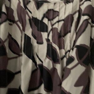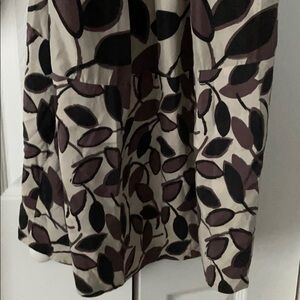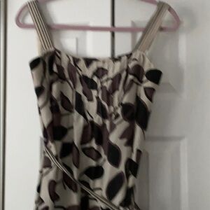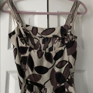 Lovely strip straps meet brown, cream and black free flowing leaves throughout. Slight lowered back and well made! Pleating in front is a beautiful plus...