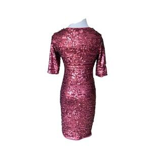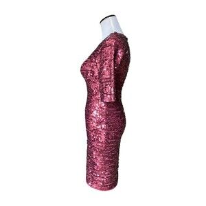 Turn heads with this dazzling BCBG Max Azria Marta dress, originally retailing for $338. This figure-hugging bodycon silhouette features glittering wine sequins on a stretch mesh base for a glamorous, curve-enhancing fit. With its elegant half sleeves and classic crew neckline, this dress is perfect for cocktail parties, weddings, holiday soirées, or a night out. Fully lined for comfort, it embodies sophisticated glam with a modern edge.