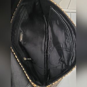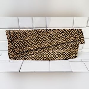 BCBGMAXAZRIA Ladies Tan Black Straw Like Large Envelope Clutch Asymmetrical Flap Magnetic Closure