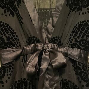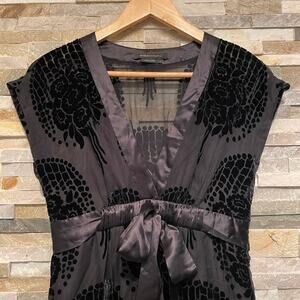 This BCBGMAXAZRIA velvet burnout dress is a sophisticated Y2K-era beauty with luxe detailing. Made from a rayon-silk blend, it features sheer mesh paneling, flocked floral velvet throughout, a satin ribbon waist tie, and ruched hem trim for a dramatic, romantic finish.