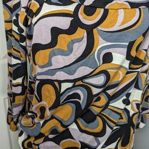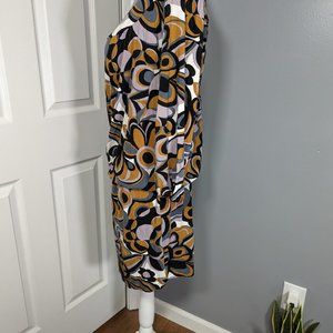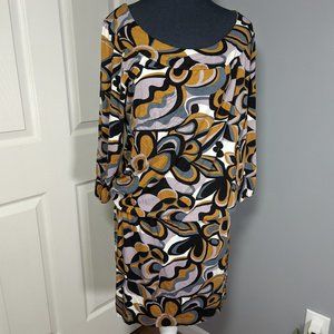 BCBGMAXAZRIA Abstract Floral Dress. Size L. Colors - Black, gold, grey, white, and lavender. 3/4 sleeves with elastic cuffs. The dress has an elastic waist. In the pictures, I have the elastic part lower on the dress form instead of the waist. There is a picture of how long the skirt part of the dress is from the elastic. Rayon/spandex blend. Hand wash/line dry. See pics for measurements.