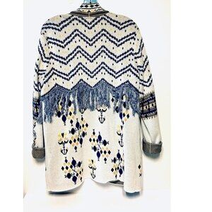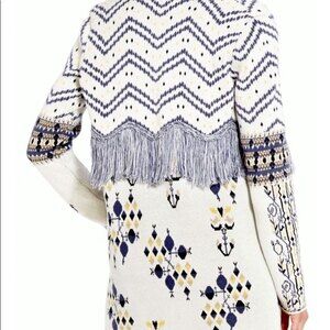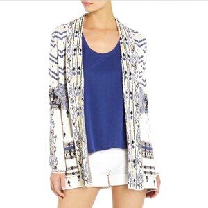 BCBGMAXAZRIA Amur Floral Jacqua Fringe Trimmed Patterned Cotton Cardigan in Blue Depths M