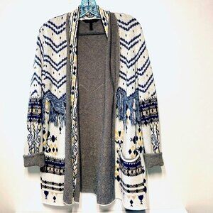 Take your look in a wanderlust-cool direction with this eclectic cardigan, patterned in a mix of tribal-inspired motifs and adorned with fringe